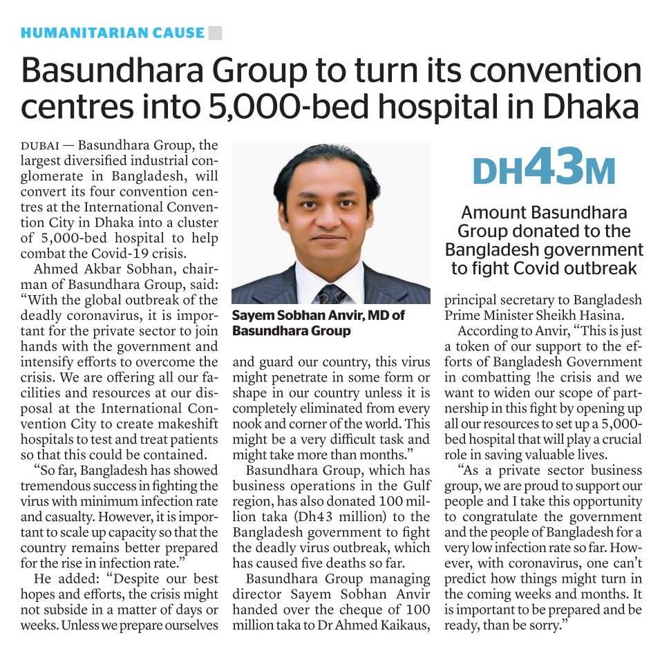 Dubai - Basundhara Group, the largest diversified industrial conglomerate in Bangladesh, will convert its four convention centres at the International Convention City in Dhaka into a cluster of 5,000-bed hospital to help combat the Covid-19 crisis. Ahmed Akbar Sobhan, chairman of Basundhara Group, said: "With the global outbreak of the deadly coronavirus, it is important for the private sector to join hands with the government and intensify efforts to overcome the crisis. We are offering all our facilities and resources at our disposal at the International Convention City to create makeshift hospitals to test and treat patients so that this could be contained. "So far, Bangladesh has showed tremendous success in fighting the virus with minimum infection rate and casualty. However, it is important to scale up capacity so that the country remains better prepared for the rise in infection rate."
